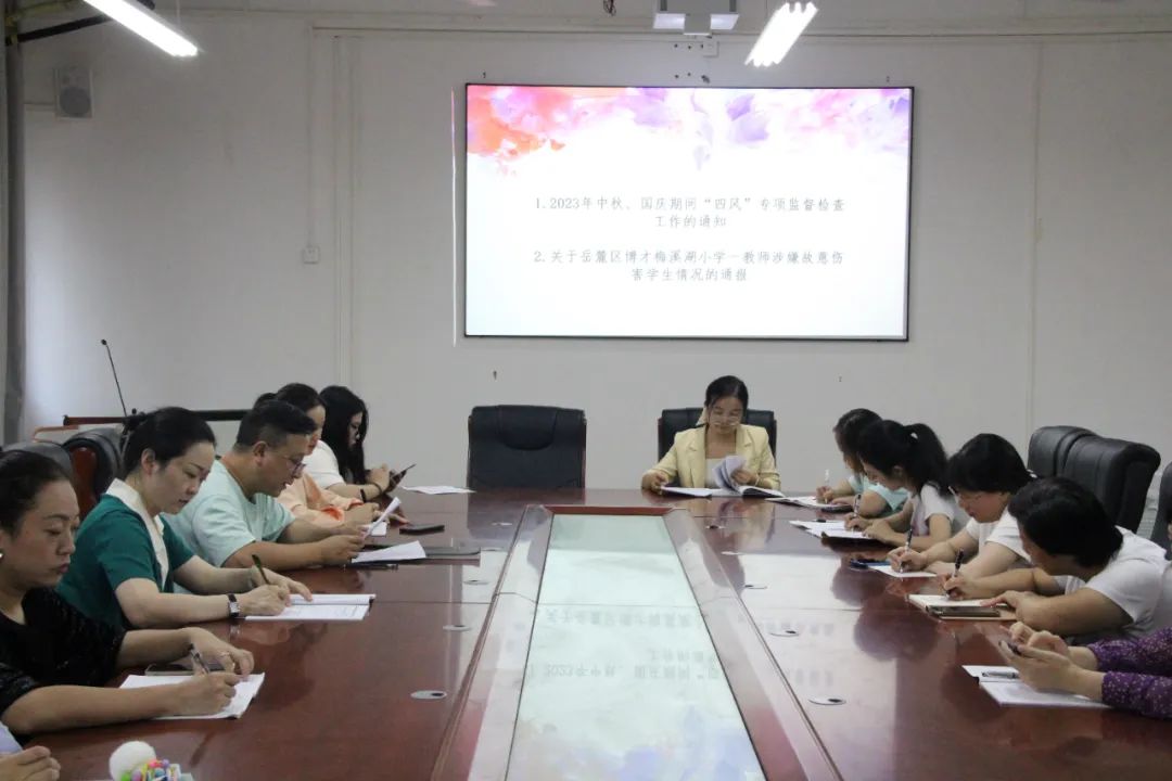 会议第二项,马奕斌带领全体教师解读《关于岳麓区博才梅溪湖小学一教师涉嫌故意伤害学生情况的通报》,为贯彻落实教育部、省委省政府领导批示精神,切实加强师德师风建设和学生安全管理,马奕斌进一步向大家剖析《通报》中的工作要求:一是各地个学校要切实将教师师风建设与学生安全管理工作紧抓不放;二是各地应严把教师队伍入口质量关;三是建立师德失范风险发现机制,排查问题隐患;四是进一步严格规范教师从教行为,细化制定教职员工日常教育管理制度与教育教学行为规范;五是建立健全教学设施设备管理制度;六是落实师德师风问题报告与线索核查机制;七是健全应急处理机制。