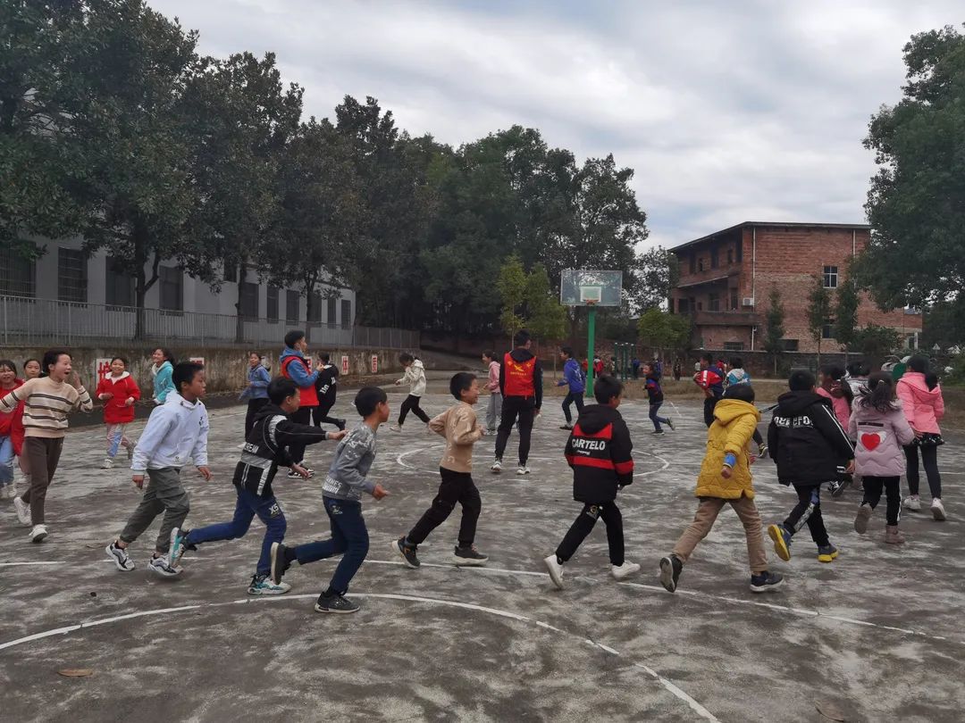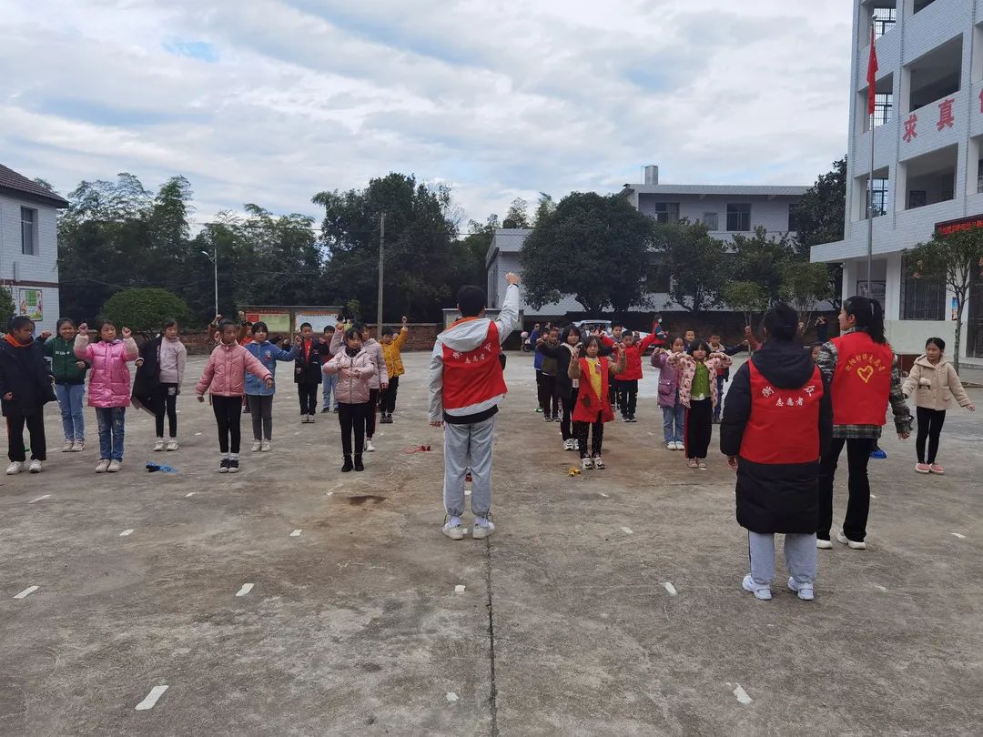为了进一步落实结对帮扶工作,在2021年11月9日的中午,我们小教、数理学院组织了一批“同心牵手”支教志愿者再次乘大巴来到了常宁市洋泉镇同心村杉树完小。不同于上次的调研,在这次活动中,我们组织了老师志愿者和学生志愿者开展了第一次课后服务志愿活动:课间律动、趣味武术、花式跳绳、小小主持人等。
